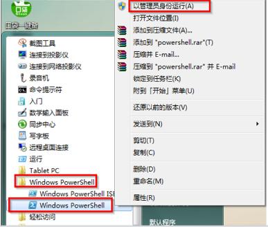 2、點(diǎn)擊“Windows PowerShell”文件夾,右鍵單擊Windows PowerShell應(yīng)用程序,在出現(xiàn)的右鍵菜單中選擇“以管理員身份運(yùn)行(A)”。