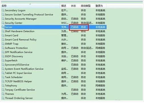 2、在打開的服務窗口中,將Server的啟動類型修改為“自動”,“服務狀態”修改為“已啟動”。
