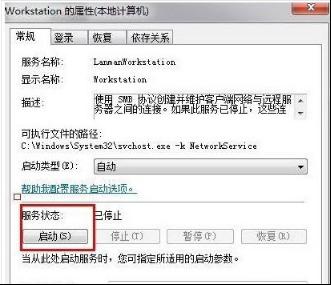 3、在Workstation的名稱上雙擊,打開的屬性中,將“啟動類型”修改為“自動”,“服務狀態”修改為“已啟動”。