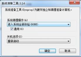 3、彈出系統(tǒng)準(zhǔn)備工具窗口,在系統(tǒng)清理操作中選擇 “進(jìn)入系統(tǒng)全新體驗(OOBE)”,在下方的“通用”前面打勾, 在關(guān)機(jī)選項中選擇“重新啟動”,點(diǎn)擊“確定”按鈕。