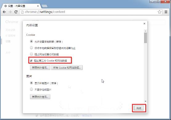 4、在出現的內容設置界面,點選“阻止第三方Cookie和網站數據”后點擊“完成”。