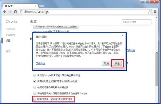 5、返回到隱私設置中,勾選“隨瀏覽流量一起發送‘請勿跟蹤’請求”,然后就會彈出一個請勿跟蹤的窗口,點擊“確定”