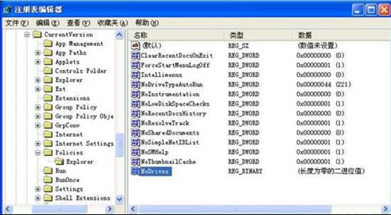 3、新建二進制值“NoDrives”,默認鍵值均是00000000,表示不隱藏任何驅動器。鍵值由四個字節組成,每個字節的每一位(bit)對應從A:到Z:的一個盤,當相應位為1時,“我的電腦”中相應的驅動器就被隱藏了。第一個字節代表從A到H的8個盤,即01為A,02為B,04為C……依次類推,第二個字節代表I到P,第三個字節代表Q到X,第四個字節代表Y和Z。比如要關閉C盤,將鍵值改為04000000;要關閉D盤,則改為08000000,若要關閉C盤和D盤,則改為0C000000(C是十六進制,轉成十進制就是12)。