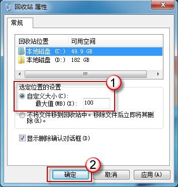 4、比如用戶把最大值設(shè)置為 100 MB 時(shí), 當(dāng)刪除大于 100 MB 的文件時(shí)就會(huì)提示是否永久刪除。另外,系統(tǒng)默認(rèn)選擇本地磁盤 C:,這說(shuō)明現(xiàn)在是對(duì)本地磁盤 C: 的文件和文件夾進(jìn)行設(shè)置,要對(duì)本地磁盤 D: 進(jìn)行設(shè)置,請(qǐng)先選中再進(jìn)行自定義設(shè)置,如果你有更多磁盤分區(qū),相應(yīng)操作以此類推。)