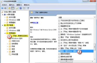 2、在組策略編輯器中依次點(diǎn)擊“用戶配置”——“管理模板”——“開(kāi)始菜單和任務(wù)欄”,在右側(cè)窗口中找到并雙擊“刪除操作中心圖標(biāo)”選項(xiàng)。