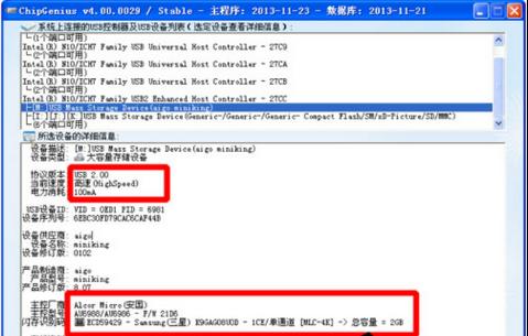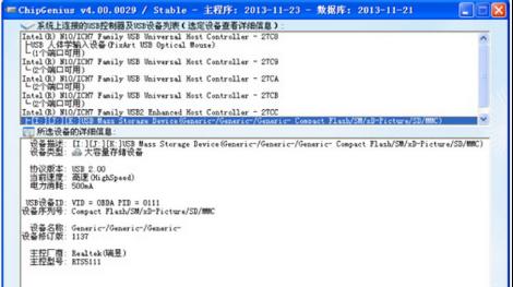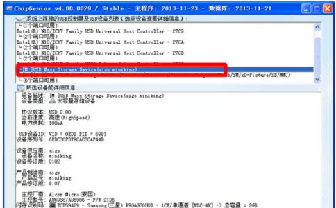 2、 chip genius會自動識別電腦所加載的usb控制器和設備,如圖片上半部分,下半部是具體的usb設備信息。