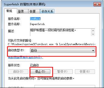 4、在打開的Superfetch服務窗口中,將“啟動類型”改成“已禁用”,最后點擊“停止”按鈕,再點擊“應用”——“確定”按鈕保存即可。