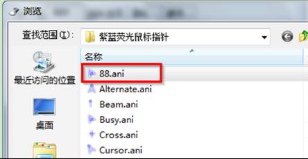 4、在“瀏覽”界面中,選擇喜歡的“紫藍熒光鼠標指針”,再點擊“打開”按鈕。