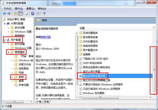 | Windows 7,中文名稱視窗7,是由微軟公司(Microsoft)開發的操作系統,內核版本號為Windows NT 6.1。Windows 7可供家庭及商業工作環境:筆記本電腦 、平板電腦 、多媒體中心等使用。Windows 7可供選擇的版本有:入門版(Starter)、家庭普通版(Home Basic)、家庭高級版(Home Premium)、專業版(Professional)、企業版(Enterprise)(非零售)、旗艦版(Ultimate)。 命令提示符有著強大的功能,也是用戶常使用的功能,通過命令提示符可快速運行一些操作,給用戶帶來了很多方便。但是也存在著一定的安全隱患,當電腦給他人借用時,如果運行命令提示符運行某些命令時,有可能會導致系統被破壞的問題。針對此問題,現小編給大家介紹設置系統之家win7旗艦版yn系統禁用命令提示符的方法,具體操作如下:1、按“win+r”打開運行,輸入“gpedit.msc”命令后按回車,或點擊確定。 2、在打開的本地組策略編輯器,從左邊欄目中依次進入“用戶配置” — “管理模塊” — “系統”,在右側窗口中,下拉滾動條,雙擊“阻止訪問命令提示符”選項。 ![]() 3、在彈出的編輯窗口中,選擇“已啟用”選項,將下方“是否也要禁用命令提示符腳本處理”改為“是”,然后按“確定”按鈕保存退出組策略。 ![]() 通過以上的方法設置后,就完禁止了命令提示符的操作了,有需要的朋友可以參考以上方法進行設置。 windows 7 的設計主要圍繞五個重點——針對筆記本電腦的特有設計;基于應用服務的設計;用戶的個性化;視聽娛樂的優化;用戶易用性的新引擎。 跳躍列表,系統故障快速修復等,這些新功能令Windows 7成為最易用的Windows。 |