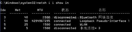 2、在打開(kāi)的命令行窗口中,輸入 netsh i i show in運(yùn)行,在以上顯示內(nèi)容中找到你用來(lái)上網(wǎng)連接的Idx號(hào)碼,在下面命令中使用 (比如小編這里上網(wǎng)的網(wǎng)卡是“WLAN”所以Idx為5)。