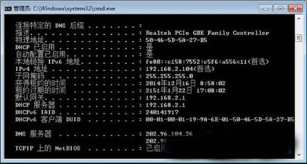 1、點(diǎn)擊“開(kāi)始”——“運(yùn)行”,鍵入“cmd”命令后按回車,打開(kāi)命令提示符窗口,輸入“ipconfig /all”,按下回車鍵,顯示其網(wǎng)絡(luò)配置,檢查IP地址,子網(wǎng)掩碼,默認(rèn)網(wǎng)關(guān),DNS服務(wù)器地址是否正確。