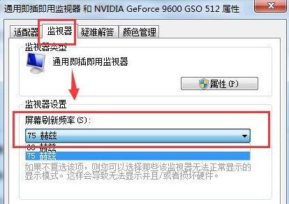 3、在彈出的設置頁中再切換到“監(jiān)視器”選項卡,然后在屏幕刷新率中設置顯示器的刷新率,一般來說如果CRT顯示器分辨率設置為1024X768的話那么設置為80或85是是最高了,當然你如果不知道設置多少為準可一級一級住上調(diào),如果遇上顯示器黑屏,過15秒會自動跳回原來刷新率的,一般情況下,可承受80-85CRT。