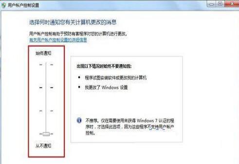3、彈出的用戶賬戶控制設(shè)置窗口中,將通知條件調(diào)到最低的“從不通知”,然后點(diǎn)擊確定保存即可。