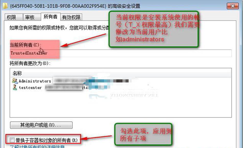 | Windows 7,中文名稱視窗7,是由微軟公司(Microsoft)開發的操作系統,內核版本號為Windows NT 6.1。Windows 7可供家庭及商業工作環境:筆記本電腦 、平板電腦 、多媒體中心等使用。Windows 7可供選擇的版本有:入門版(Starter)、家庭普通版(Home Basic)、家庭高級版(Home Premium)、專業版(Professional)、企業版(Enterprise)(非零售)、旗艦版(Ultimate)。 電腦系統使用久后,就會有一些無效數據需要清除,當用戶通過刪除注冊表中的一些項來清除無效數據,一些用戶在刪除過程中出現了“刪除項時出錯”的提示,怎么回事呢?其實這是由于權限不足的原因,現小編給大家介紹刪除數據時深度技術Win7系統注冊表提示出錯的解決措施。![]() 1、在需要刪除的注冊表項上右鍵,選擇“權限”; 2、在彈出的設置窗口,點擊“高級”按鈕; 3、在打開的高級安全設置窗口,切換到“所有者”標簽頁,此時可看到所有者是“TrusteInstaller”這是一個Windows內部管理員帳戶,它權限非常高,而我們需要將把所有者更改為當前登錄帳戶,比如Administrator,點擊選擇所有者更改為administrators,同時勾選替換子容器和對象的所有者(相當于把該注冊表項下的子項都更改成當前所有者); 4、點擊應用、確定后返回到權限窗口,選擇當前用戶賬號為administrators。 5、刪除的時候還是提示出錯,請依次操作:需要操作的項上右鍵選擇權限——選擇當前的用戶名——高級——權限選項卡,點擊當前用戶名,同時勾選使用可從此對象集成的權限替換所有子對象的權限,點擊應用——確定即可) windows 7 的設計主要圍繞五個重點——針對筆記本電腦的特有設計;基于應用服務的設計;用戶的個性化;視聽娛樂的優化;用戶易用性的新引擎。 跳躍列表,系統故障快速修復等,這些新功能令Windows 7成為最易用的Windows。 |