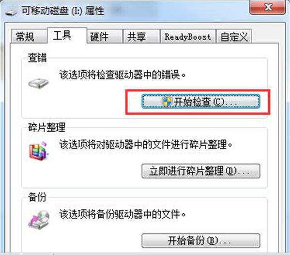 2、在U盤圖標上右鍵,選擇屬性,切換到“工具”標簽頁,并點擊“開始檢查”。