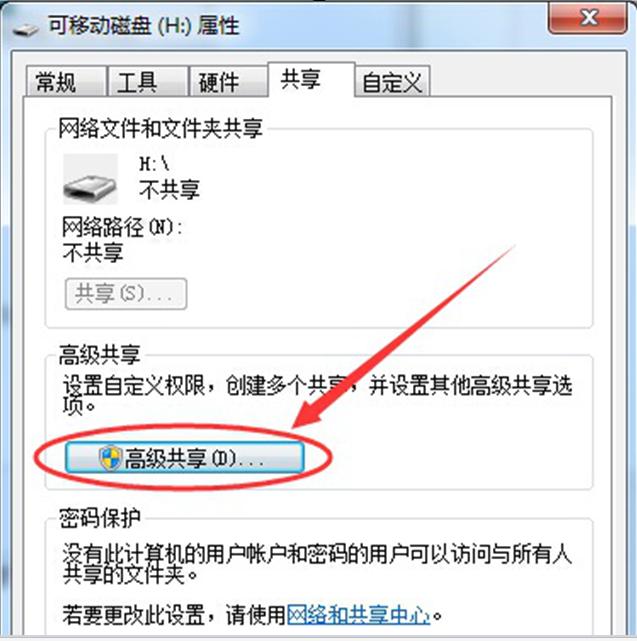 2、完成后USB驅(qū)動(dòng)安裝后,打開我的電腦,右鍵U盤盤符,選擇屬性,在打開的屬性窗口中,切換到“共享”標(biāo)簽頁(yè),點(diǎn)擊“高級(jí)共享”。