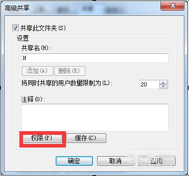 3、在共享此文件夾前面打勾,點(diǎn)擊“權(quán)限”設(shè)置共享權(quán)限。