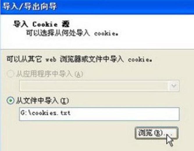 2、點擊“瀏覽”按鈕找到并選中事先導(dǎo)出的Cookie文件,并點擊“下一步”按鈕,選擇導(dǎo)入來源;