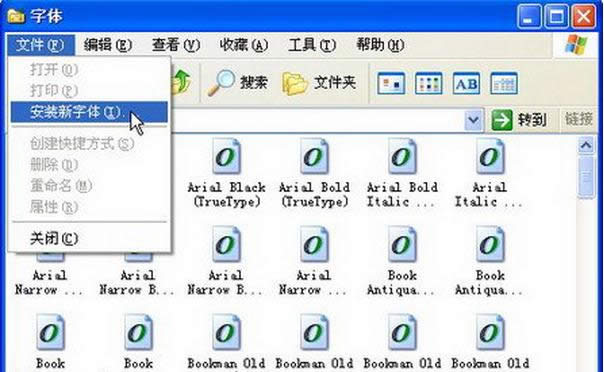 2、在打開的字體文件夾中,點(diǎn)擊菜單欄“文件——安裝新字體”。