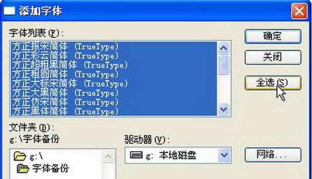 3、彈出“添加字體”窗口,點(diǎn)擊“驅(qū)動(dòng)器”區(qū)域的下拉三角按鈕,選擇事先備份保存的字庫文件驅(qū)動(dòng)器對(duì)應(yīng)的文件夾。用戶可點(diǎn)擊“全選”按鈕選中所有的字體或根據(jù)自己的需要選擇所要的字體,然后點(diǎn)擊“確定”按鈕。