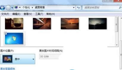 2、在桌面背景窗口中,選擇好喜歡的桌面背景圖片,然后拉動(dòng)右側(cè)的滑動(dòng)條至底部,在圖片位置點(diǎn)擊倒三角形,選擇下拉菜單中的“居中”。