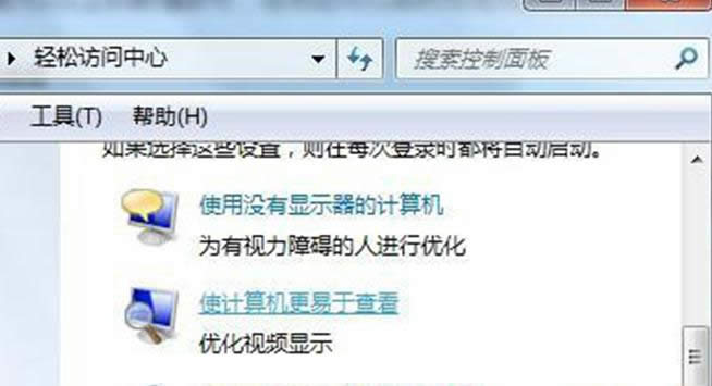 2、在彈出來的輕松訪問中心面板中,點擊“使計算機更易查看”;