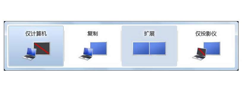 安裝了Windows7系統(tǒng),切換顯示方式就變得非常簡(jiǎn)單,都只需要按Windows+P鍵,就可打開(kāi)輸出方式的切換界面,只需要用鼠標(biāo)直接點(diǎn)擊對(duì)應(yīng)的模式,或繼續(xù)按Windows+P鍵,在各種模式直接進(jìn)行切換。