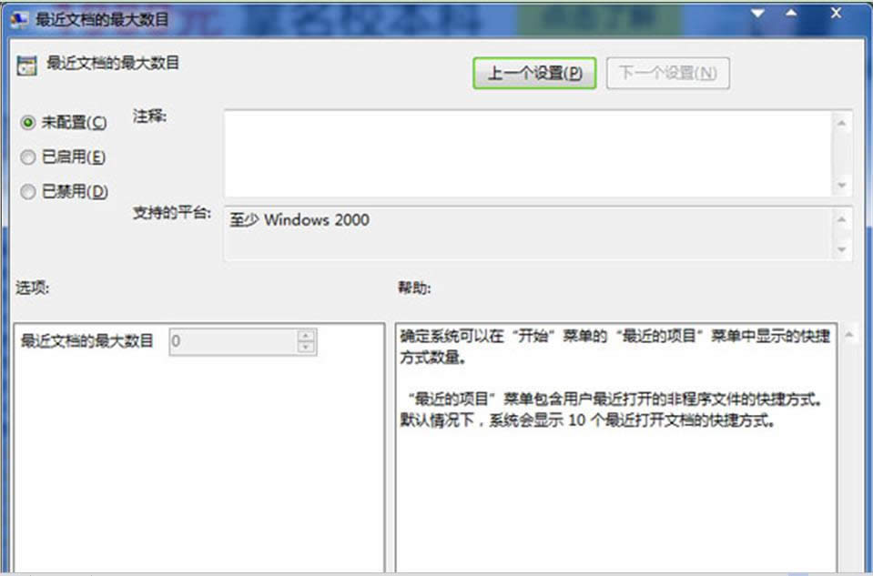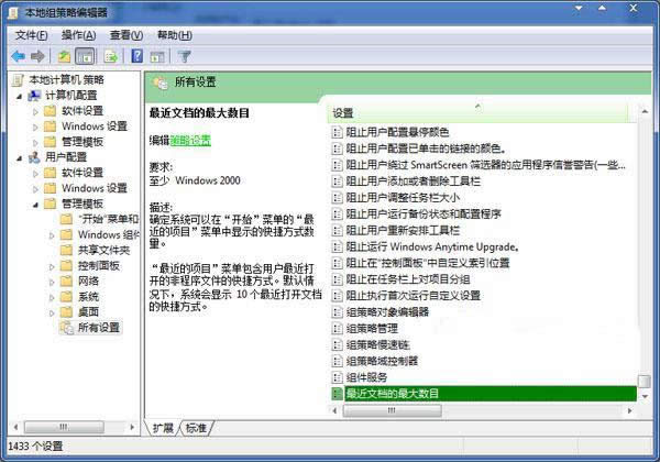 | Windows 7,中文名稱視窗7,是由微軟公司(Microsoft)開發的操作系統,內核版本號為Windows NT 6.1。Windows 7可供家庭及商業工作環境:筆記本電腦 、平板電腦 、多媒體中心等使用。Windows 7可供選擇的版本有:入門版(Starter)、家庭普通版(Home Basic)、家庭高級版(Home Premium)、專業版(Professional)、企業版(Enterprise)(非零售)、旗艦版(Ultimate)。 打開Windows7系統開始菜單,可看到最近文檔中會顯示一些最近用過的文檔名稱,有時候每一次看到數目都不一樣。這個顯示的數目能否控制呢?答案是肯定的,下面小編給大家分享中關村Win7系統最近文檔顯示數目的控制方法。具體如下:1、點擊“開始——運行”,輸入“gpedit.msc”命令后按回車,打開Win7組策略編輯器。 2、點擊“用戶配置——管理模板——所有設置”,在右側窗口中找到并雙擊“‘最近的文檔’的最大數目”的選項。 ![]() 3、彈出的屬性窗口上選擇“已啟用”,在下面 “‘最近的文檔’的最大數目”欄里自定義“我最近的文檔”顯示多少個最近打開的文檔。 以上就是關于修改Windows7系統最近文檔顯示數目的方法介紹了,通過以上介紹后,其它用戶感興趣的話,也可按照以上方法隨意控制Win7開始菜單中的最近文檔數目。 windows 7 的設計主要圍繞五個重點——針對筆記本電腦的特有設計;基于應用服務的設計;用戶的個性化;視聽娛樂的優化;用戶易用性的新引擎。 跳躍列表,系統故障快速修復等,這些新功能令Windows 7成為最易用的Windows。 |