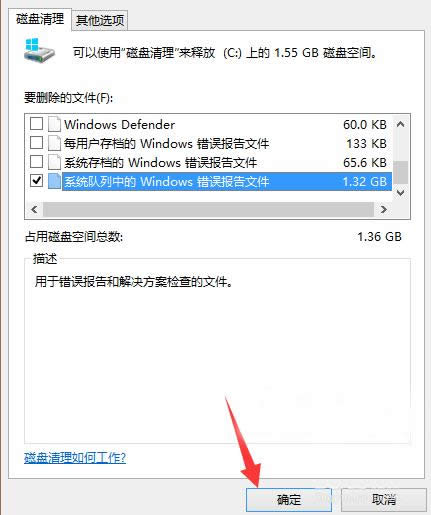 6、在“要刪除的文件選項”可看到系統隊列中的windows錯誤報告文件,選中然后點擊下方“確定”,便可將其刪除