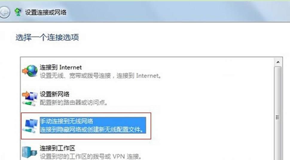 3、選擇“手動(dòng)連接到無線網(wǎng)絡(luò)”的選項(xiàng)。