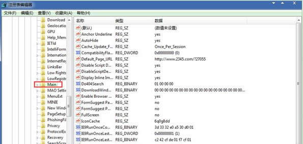 2、依次打開HKEY_CURRENT_USER\Software\microsoft\Internet Explorer\Main;