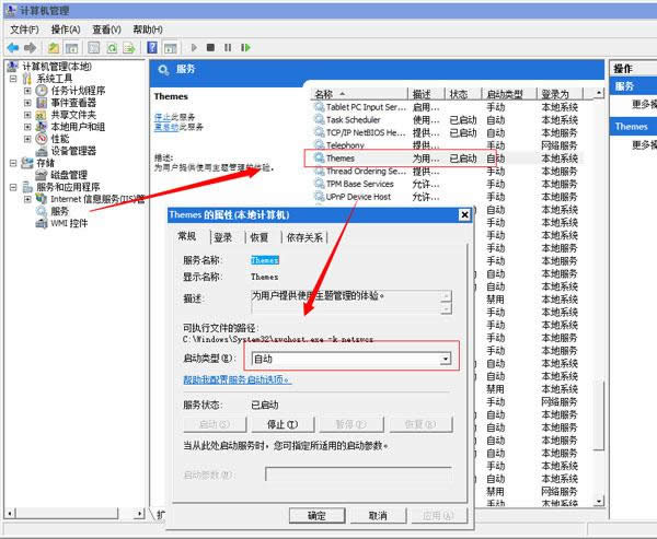 2、在打開的計算機(jī)管理窗口中,點(diǎn)擊“服務(wù)與應(yīng)用程序——服務(wù)——Themes服務(wù)”,改成自動即可。