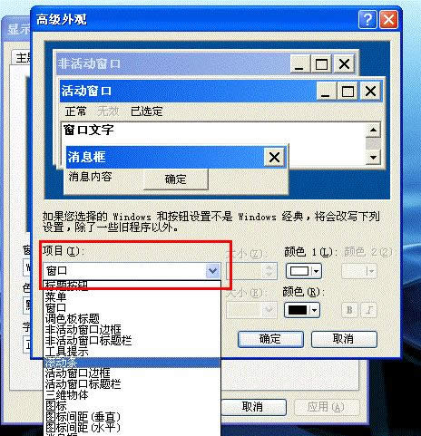 3、在“高級(jí)外觀”設(shè)置窗口的下拉列表選擇“窗口”。
