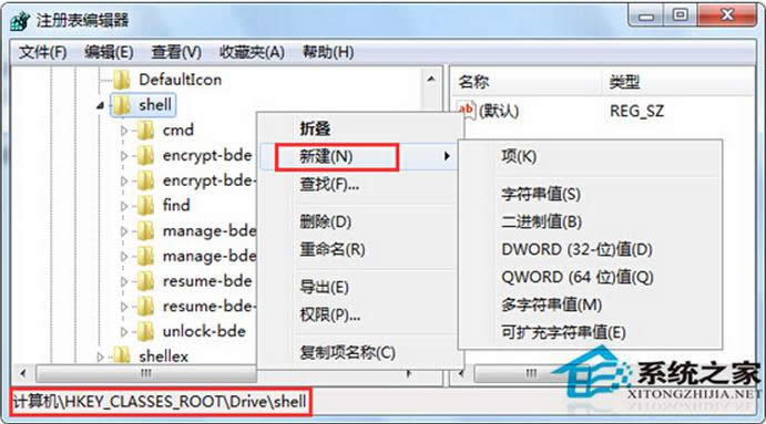 2、在打開的注冊表編輯器窗口中,在左側(cè)窗口依次點(diǎn)擊展開以下注冊項HKEY_CLASSES_ROOT\Drive\shell,