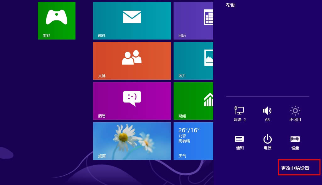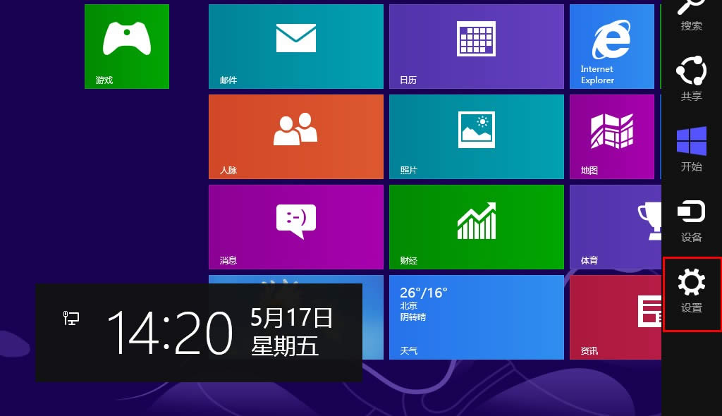 | Windows 7,中文名稱視窗7,是由微軟公司(Microsoft)開發的操作系統,內核版本號為Windows NT 6.1。Windows 7可供家庭及商業工作環境:筆記本電腦 、平板電腦 、多媒體中心等使用。Windows 7可供選擇的版本有:入門版(Starter)、家庭普通版(Home Basic)、家庭高級版(Home Premium)、專業版(Professional)、企業版(Enterprise)(非零售)、旗艦版(Ultimate)。 Windows8系統的UI比起windows7操作系統的UI更加的炫麗。但是部分用戶仍然覺得個性化設置不符合自己的要求或不滿意。那么如何對系統界面進行自定義設置呢?下面大地教你Windows8個性化設置的方法。 1.按鍵盤上的“Win+C”打開“Charms ”點擊“設置”