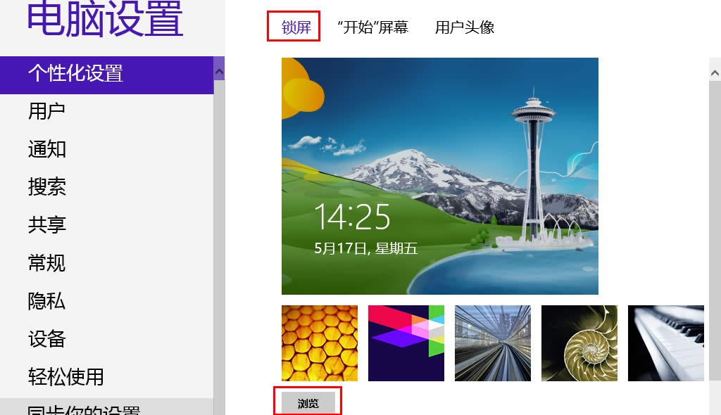 3.打開后選擇“個性化設置”,即可看到“鎖屏”,“開始屏幕”,“用戶頭像”三個選項,在這里即可進行個性化設置。點擊“鎖屏”,在下方選擇背景圖片,也可以選擇瀏覽自定義圖片。