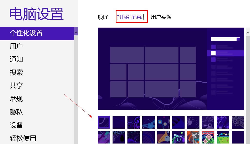 4.點擊“開始屏幕”可為Metro桌面更改背景圖片和背景顏色。下面是背景圖片和背景顏色,用戶自動選擇即可。