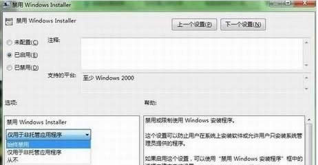 3、在“禁用Windows Installer”中,選擇“已起用”,單擊“僅用于非托管應用程序”,選擇“始終禁用”,點擊“確定”。