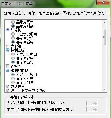 第二步、在系統(tǒng)彈出的“自定義“開始”菜單”窗口,我們進(jìn)行設(shè)置。