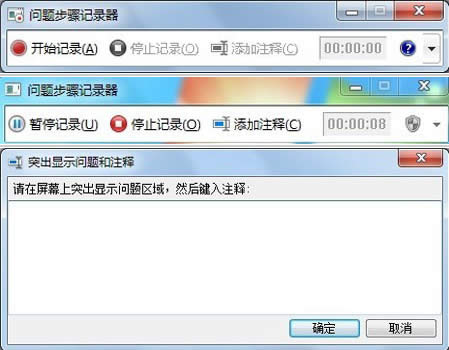單擊“開(kāi)始記錄”按鈕,即可將“問(wèn)題步驟記錄器”處于錄制狀態(tài),監(jiān)視屏幕上的鼠標(biāo)操作,并會(huì)顯示錄制時(shí)間。點(diǎn)擊添加注釋?zhuān)可以在屏幕上突出的問(wèn)題區(qū)域,添加和鍵入注釋?zhuān)右灾攸c(diǎn)說(shuō)明。