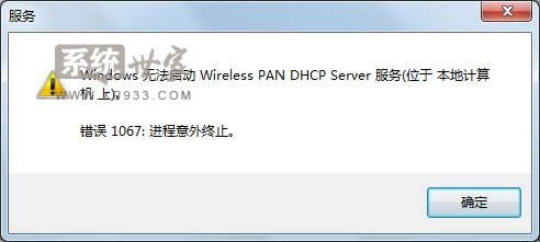 | Windows 7,中文名稱視窗7,是由微軟公司(Microsoft)開發的操作系統,內核版本號為Windows NT 6.1。Windows 7可供家庭及商業工作環境:筆記本電腦 、平板電腦 、多媒體中心等使用。Windows 7可供選擇的版本有:入門版(Starter)、家庭普通版(Home Basic)、家庭高級版(Home Premium)、專業版(Professional)、企業版(Enterprise)(非零售)、旗艦版(Ultimate)。 windows7筆記本無法啟動wireless pan dhcp server解決方法:故障現象: Windows 7系統使用無線時提示“windows無法啟動wireless pan dhcp server服務"(位于本地計算機上)。錯誤1067:進程意外終止。如下圖所示:
