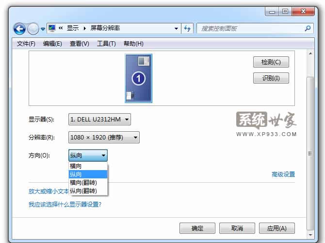 win7系統(tǒng)如何切換顯示屏幕方向? 2、在打開的屏幕分辨率窗口中,可以看到下方的方向處,點擊“方向后面的下拉按鈕就可以選擇你想要切換的方向了,比如“橫向”,可以根據(jù)自己習(xí)慣進行設(shè)置,最后點擊應(yīng)用按鈕之后再點擊確定按鈕就可以進行切換了哦。