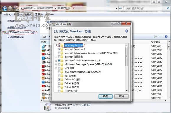 Win7搜索功能是很多Win7用戶比較常用的系統功能,通過搜索,可以快速找到電腦中的相關文件。不過最近有網友遇到了Win7搜索不能用的情況,其不知道如何解決。針對此問題,新蘿卜家園Win7系統詳解如何解決搜索不到文件故障告訴給大家。 Win7搜索不能用的原因: 1、權限受限,比如未使用管理員賬號登陸; 2、搜索服務被關閉; 通常很多電腦朋友,喜歡借助一些系統優化軟件,對系統進行深度優化,此次軟件,在選擇深度優化的時候,會關閉一些不常用的服務,比如搜索功能,這將導致搜索服務被禁用。 Win7搜索不能用的解決辦法: 1、確保使用管理員賬戶登錄的Win7系統; 2、了解Win7搜索功能在哪,如何使用,具體請閱讀:Win7搜索在哪 Win7搜索文件在哪? 3、檢查Win7搜索服務是不是被禁用了。 具體方法為,進入控制面板,然后依次進入 >- 程序 >- 程序和功能 >- 打開或關閉windows功能 >- 勾選windows search和index service”這兩項,并確定保存即可,如下如所示。