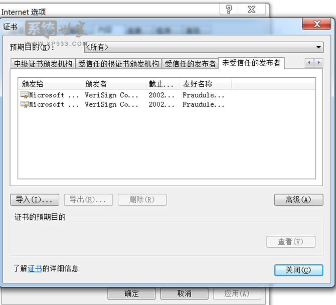 3、接著在彈出來(lái)的證書界面中,切換到“未受信任的發(fā)布者”標(biāo)簽,然后在里面選擇要?jiǎng)h除的發(fā)行者,選擇“Adobe Systerms Incoperated”項(xiàng),然后點(diǎn)擊刪除按鈕即可解決問(wèn)題了。