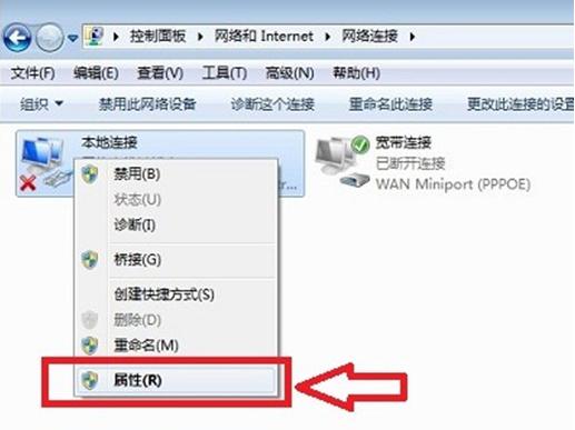 3、此時便可看到電腦的本地連接設置窗口了,右擊“本地連接”選擇屬性。