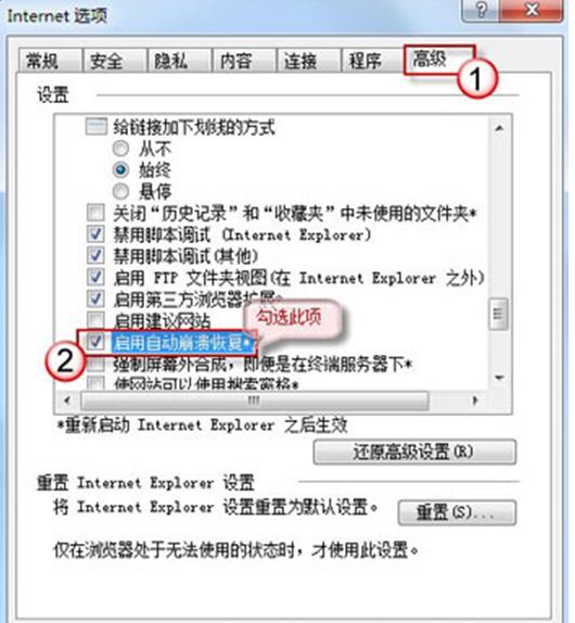 | Windows 7,中文名稱視窗7,是由微軟公司(Microsoft)開發的操作系統,內核版本號為Windows NT 6.1。Windows 7可供家庭及商業工作環境:筆記本電腦 、平板電腦 、多媒體中心等使用。Windows 7可供選擇的版本有:入門版(Starter)、家庭普通版(Home Basic)、家庭高級版(Home Premium)、專業版(Professional)、企業版(Enterprise)(非零售)、旗艦版(Ultimate)。 Win7系統中快速恢復IE崩潰時被關閉網頁的方法分享給大家,有時候用戶在使用IE瀏覽器查看資料時,難免有時會遇到IE突然崩潰的問題,造成打開的網頁都被意外關閉,突然查看中的資料一下子全沒了,興致全無,怎么辦呢?當你遇到這種現象時你是怎么處理的呢?重新查找?其實IE崩潰時被意外關閉的網頁進行快速恢復的,沒必要重新查找行,請來看看Win7系統之家分享的快速恢復方法吧,具體步驟如下:1.點擊“工具”按鈕,在彈出的下拉列表中選擇“Internet 選項”。 ![]() 2、彈出“Internet 選項”窗口,切換到“高級”選項卡;在瀏覽部分中,將“自動崩潰恢復”前面的復選框勾上。 通過在工具欄的高級選項中,勾選自動崩潰恢復選項后,重啟瀏覽器就可以輕松恢復IE崩潰時被意外關閉的網頁了。 windows 7 的設計主要圍繞五個重點——針對筆記本電腦的特有設計;基于應用服務的設計;用戶的個性化;視聽娛樂的優化;用戶易用性的新引擎。 跳躍列表,系統故障快速修復等,這些新功能令Windows 7成為最易用的Windows。 |