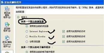 一、打開桌面,在開始菜單中找到 “控制面板” ,找到 “添加或刪除程序” 最后選擇 “設(shè)定程序訪問默認值” ,最后選擇自定義,如下圖: