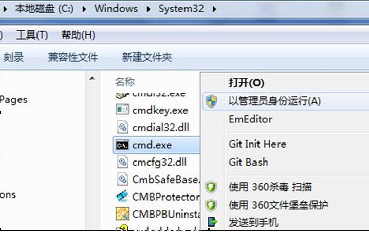 2、找到C:\Windows\System32下的cmd.exe文件,右擊并選擇“以管理員身份運行”。