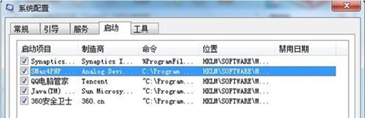 2、在系統(tǒng)配置窗口中,切換到啟動(dòng)選項(xiàng)卡下,找到一個(gè)名為Ctfmon的選項(xiàng),從下圖中可以看到?jīng)]有Ctfmon這個(gè)選項(xiàng),可能是優(yōu)化過(guò)頭直接把它直接刪除了(win7語(yǔ)言欄的名稱是Ctfmon.exe )