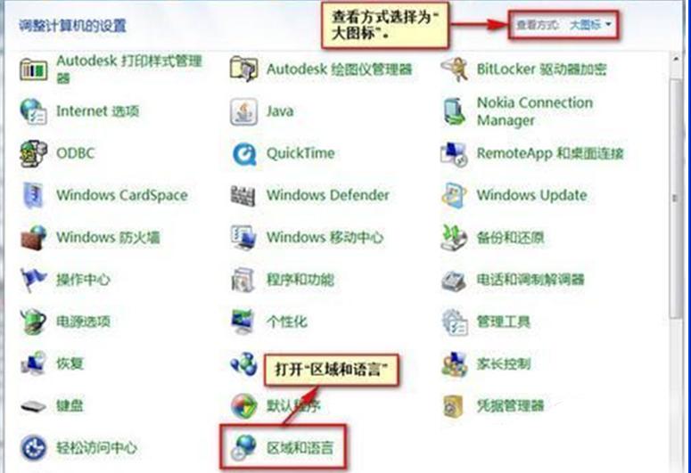 1、單擊“開始”菜單,打開“控制面板”,在“控制面板”中,選擇查看方式為“大圖標(biāo)”,打開“區(qū)域和語言”。
